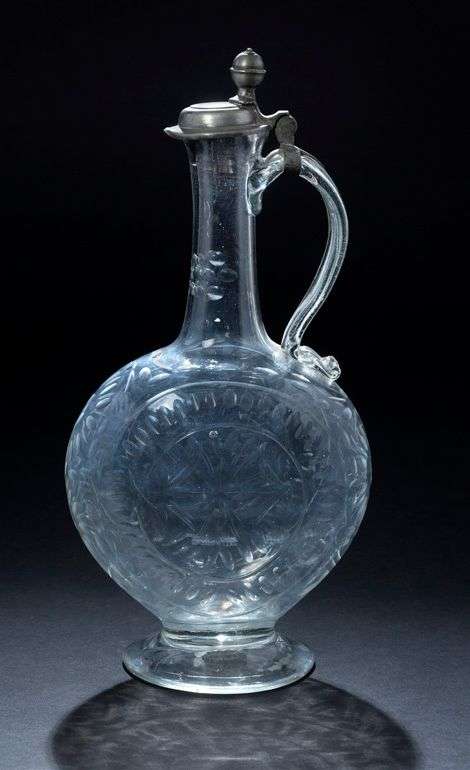 Carafe en verre taillé de forme pansue, à décor géométrique de fleurs stylisées, haut col avec anse en applique, fermée par une monture en étain.