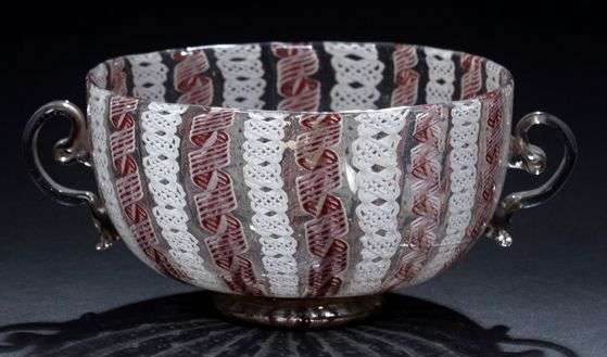 Petite coupelle en verre filé blanc et rouge à décor de rubans | anses en appliques.