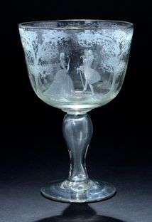 Grand verre en verre clair soufflé à décor gravé à la roue d'une scène galante avec portail, fontaine, balustrade et vase fleuri | pied de forme circulaire, jambe creuse en balustre.