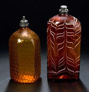 -Bouteille en verre soufflé et moulé brun miel à décor de piumi blancs. Monture et bouchon en étain vissé