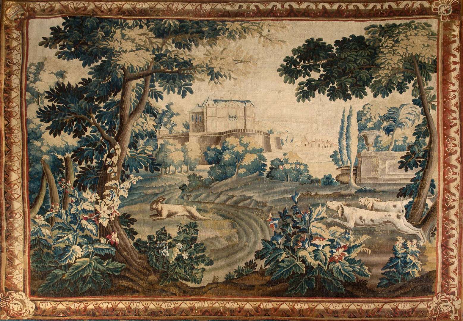 Verdure au Lièvre et aux chiens Tissée en laine et soie La tapisserie a conservé de beaux coloris et a gardé sa bordure d'origine. Elle présente des usures notamment dans les soies et d'anciennes restaurations. La tapisserie a été probablement diminuée en hauteur. La tapisserie comporte une signature dans le galon en bas à droite VITR M DM.