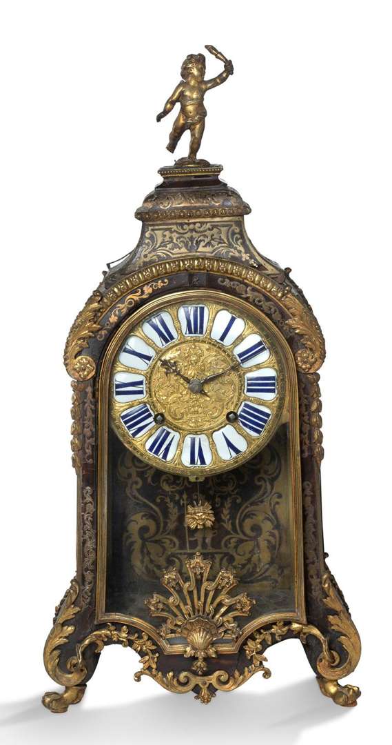 CARTEL À POSER en marqueterie en première partie de laiton découpé et gravé sur fond d'écaille et marqueterie en contrepartie dans le fond de caisse. Cadran à douze cartouches d'émail sur fond de la caisse. Ornementation de bronzes ciselés et dorés orné d'un décor de feuillages et coquille éclatée. Le cadran est surmonté d'un putti.