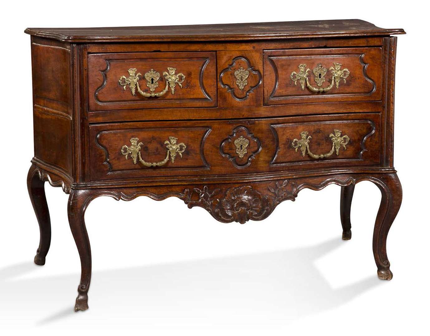 COMMODE PROVENCALE de forme sauteuse en bois naturel mouluré et richement sculpté ouvrant en façade par trois tiroirs sur deux rangs La traverse inférieure est centrée d'une coquille dans un entourage de feuillages. Elle repose sur quatre pieds cambrés terminés par des pieds de biche. Provence, XVIIIe siècle. Poignées de tirage et entrée de serrure en laiton doré