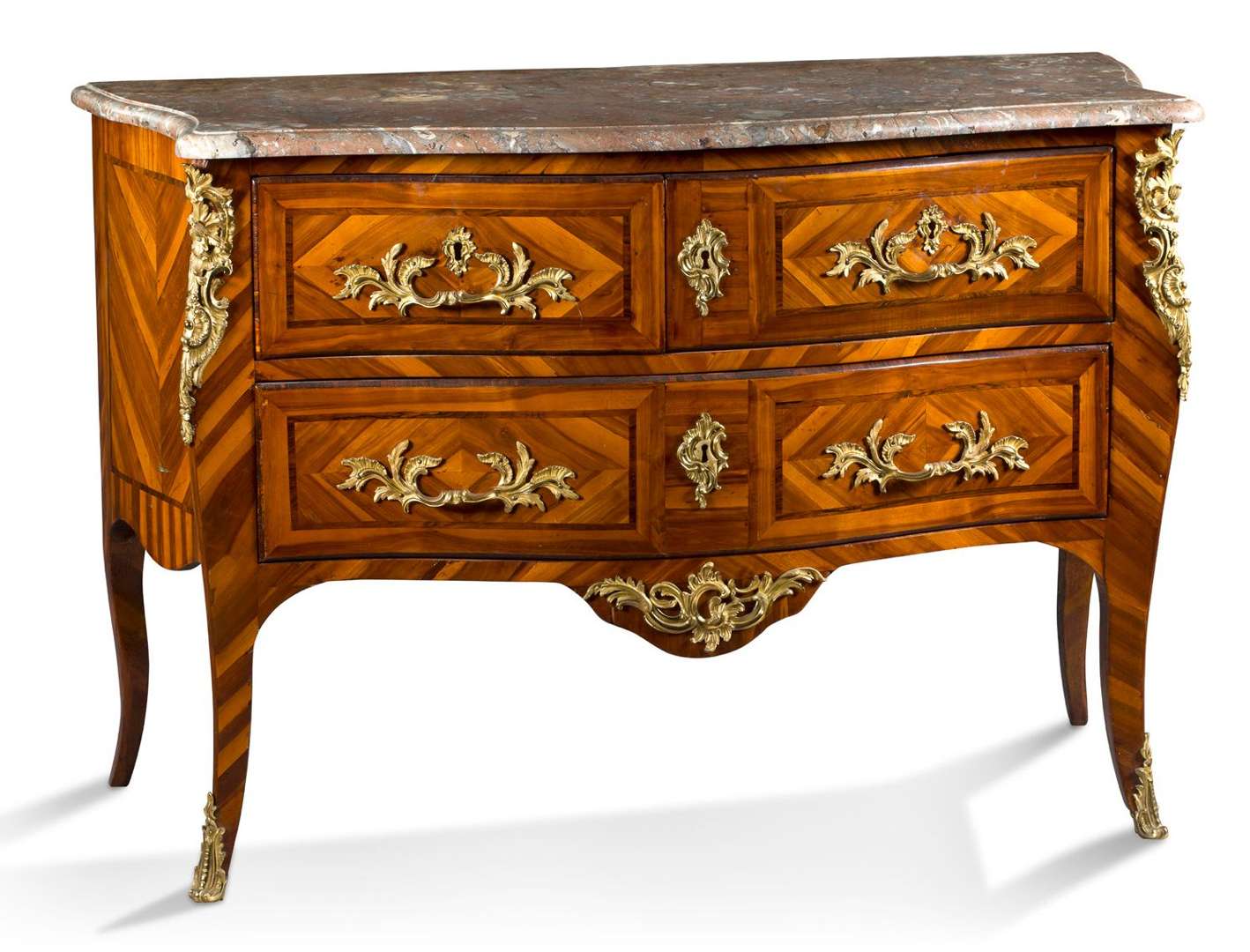 COMMODE SAUTEUSE de forme légèrement trapézoïdale en placage en frisage de bois de satiné et de bois de rose dessinant des chevrons. Elle ouvre en façade par trois tiroirs. Montants légèrement galbés, ornementation de bronze ciselé et doré à décor de feuillages telle que : entrées de serrure, poignées de tirage, chutes amortissement et sabots. Pieds légèrement galbés. Époque XVIIIe siècle