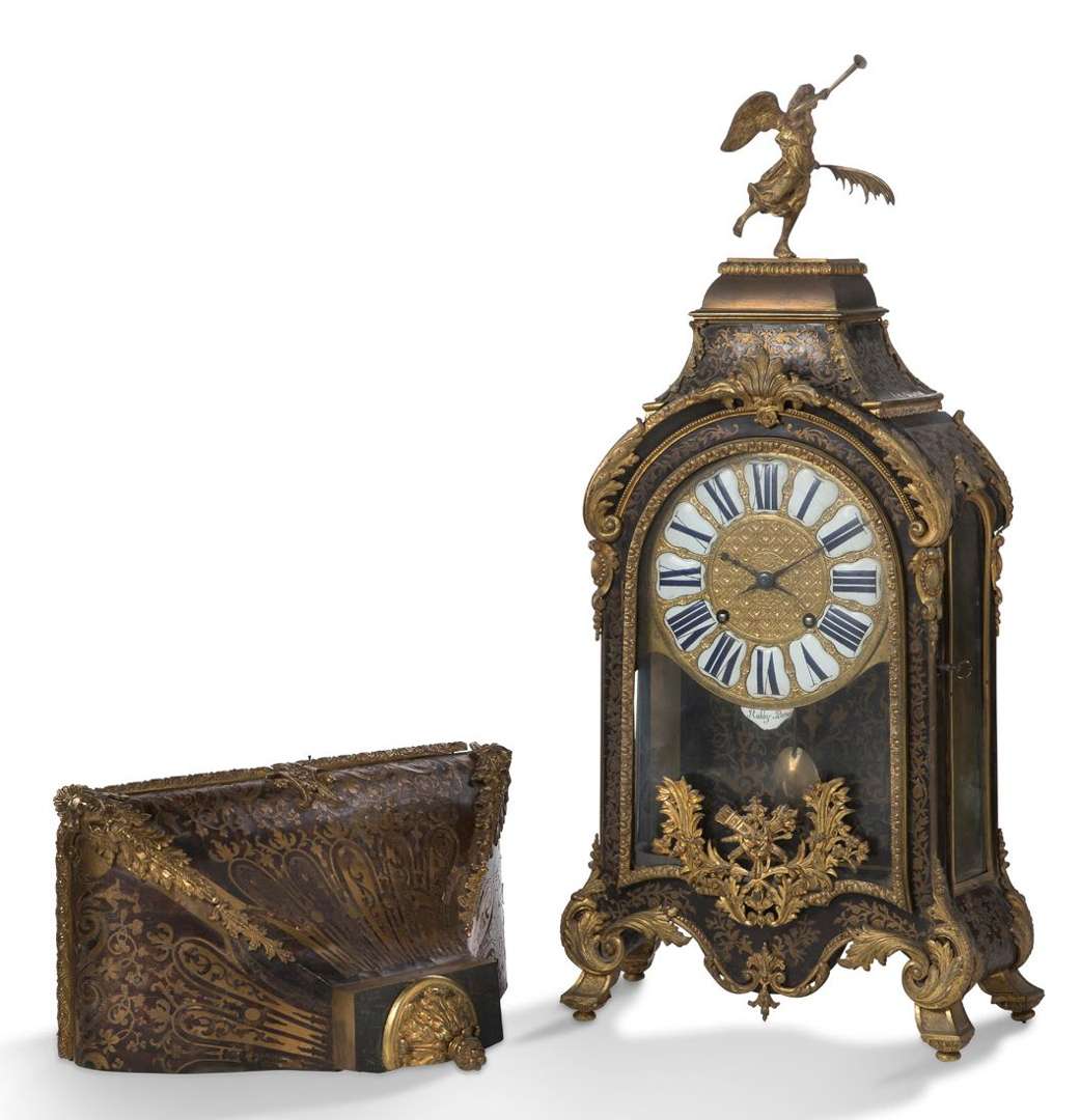 Décor en marqueterie en première partie de laiton découpé sur fond d'écaille à décor feuillagé dans le goût d'André-Charles Boulle. Ornementation de bronzes ciselés et dorés à décor de feuillages et enroulements. Cadran à douze pièces d'émail. Il est orné à l'amortissement de feuilles de lauriers et est surmonté d'une figure de Renommée. Signé Rabby à Paris. Époque XVIIIe siècle