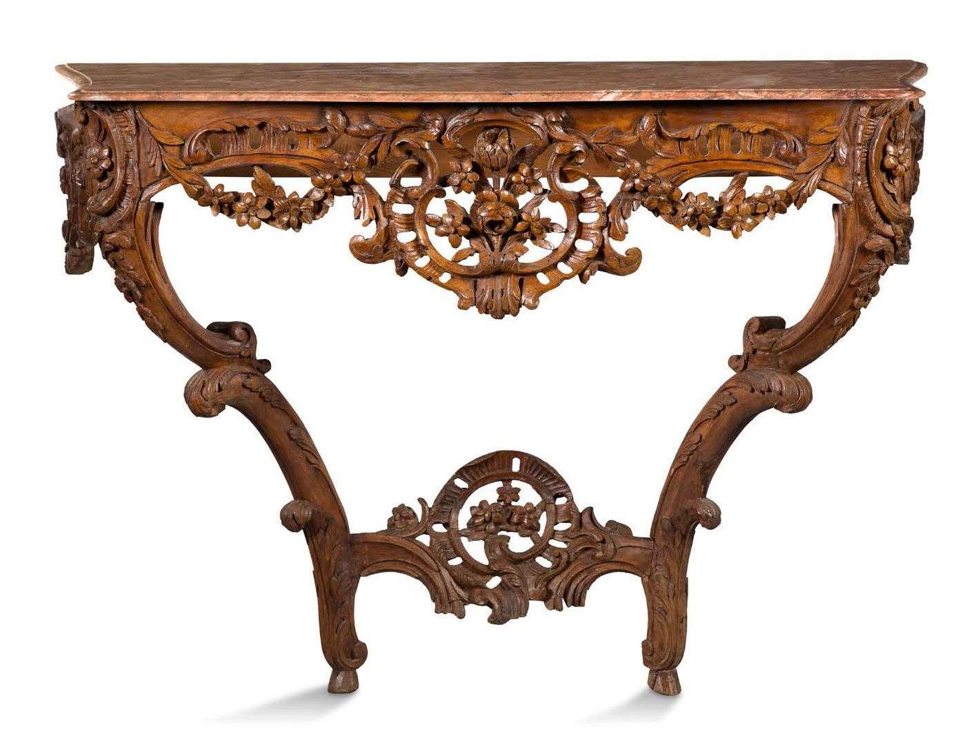 CONSOLE D'APPLIQUE en bois naturel mouluré, sculpté d'un décor ajouré en ceinture d'une large coquille éclatée, agrafes et guirlandes de fleurs. Elle repose sur deux pieds à double volutes réunis par une cartouche éclatée. Style Louis XV. Parties anciennes