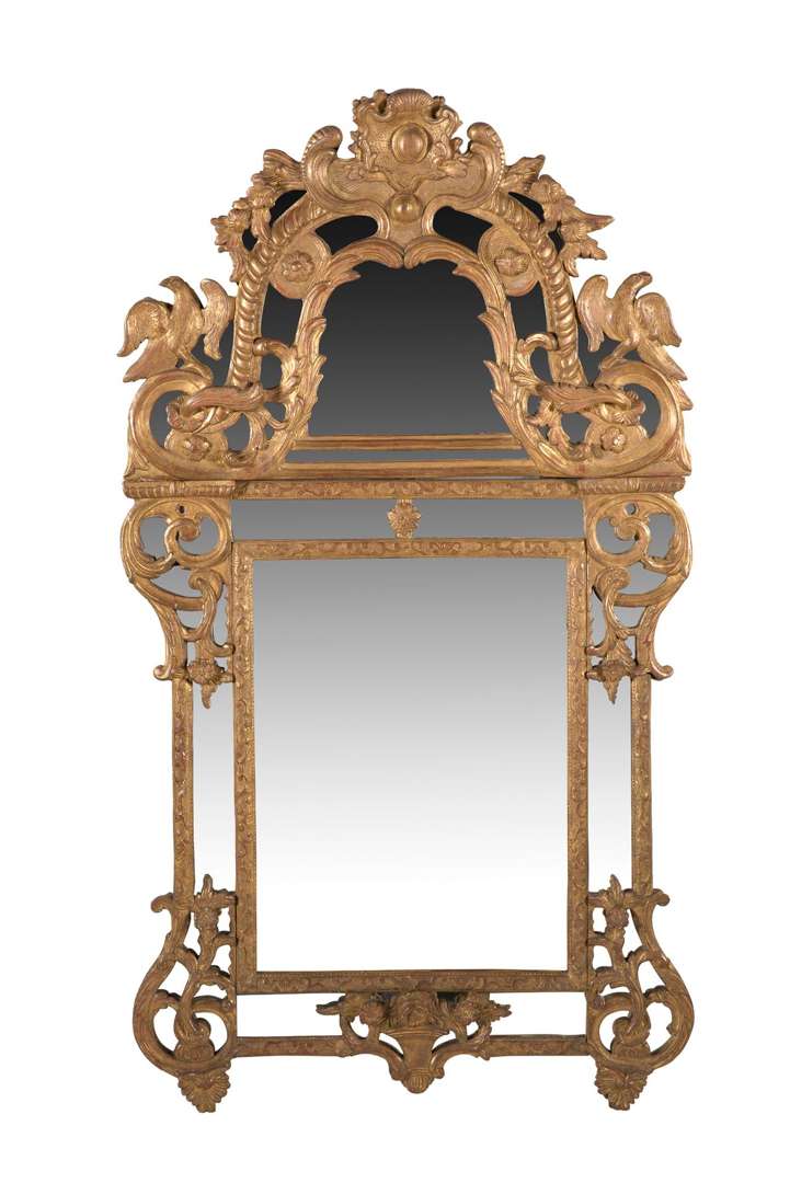 MIROIR À PARECLOSES en bois mouluré sculpté et doré à décor de rinceaux feuillagés et enroulements. Il est sommé d'un fronton orné d'une coquille et de deux volatiles. XVIIIe siècle