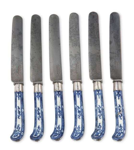 Suite de six couteaux à fruits. Manches en porcelaine à décor bleu blanc. Lames et viroles en acier. Hollande, XIXe siècle