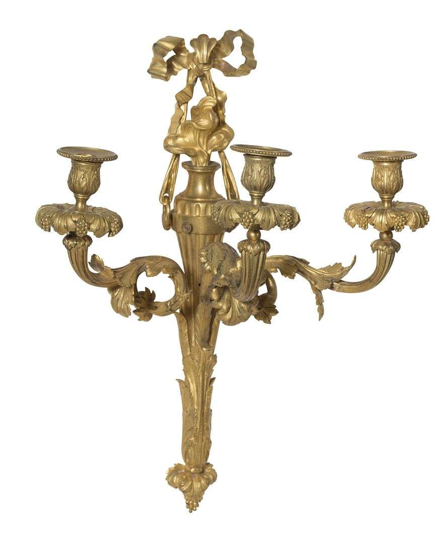 PAIRE D'IMPORTANTES APPLIQUES à trois bras de lumière en bronze finement ciselé et doré. Le fût en forme d'urne flammée à cannelures est surmonté d'un noeud de ruban. Il est orné de feuilles d'acanthes terminées par une graine éclatée. Les bras de lumière, de forme mouvementée et à riche décor feuillagé sont ornés en leur extrêmité de bouquets de pampres. Binet ciselé de feuilles d'acanthe, bobèche à rang perlé. Fin du XVIIIe siècle
