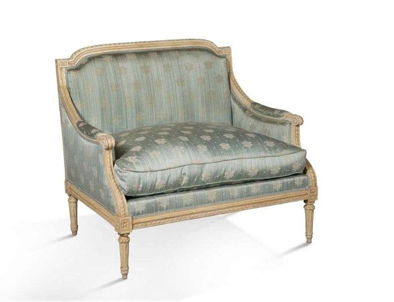 PAIRE DE MARQUISES en bois mouluré sculpté laqué crème à décor de filets rubannés. Accotoirs à manchettes terminés en enroulement. Descente d'accotoirs légèrement incurvée. Ceinture droite à dés de raccordement à rosaces. Elles reposent sur quatre pieds fuselés à cannelures rudentées. Garniture de satin bleu à motif de gerbes de blé. Époque Louis XVI.
