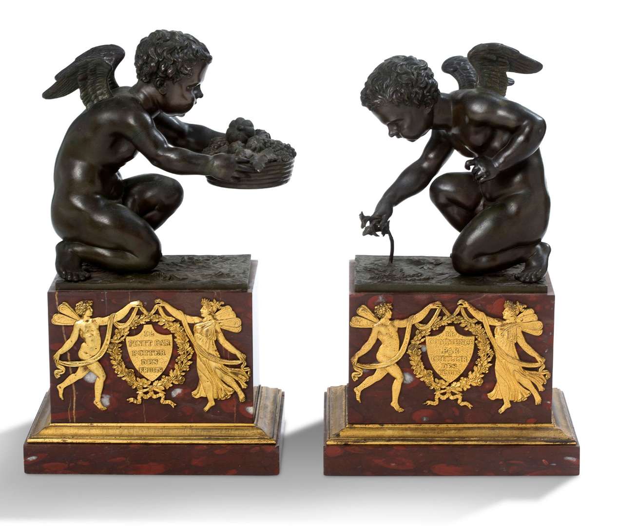 Paire de bronzes aux amours, l'un portant une corbeille de fruits, le second cueillant une fleur.Épreuves en bronze à patine brune. Socle de forme rectangulaire en marbre rouge griotte, bronzes d'appliques à décor de deux écussons « Il commence par cueillir des fleurs » et « Il finit par porter des fruits ».Fin du XVIIIe siècle