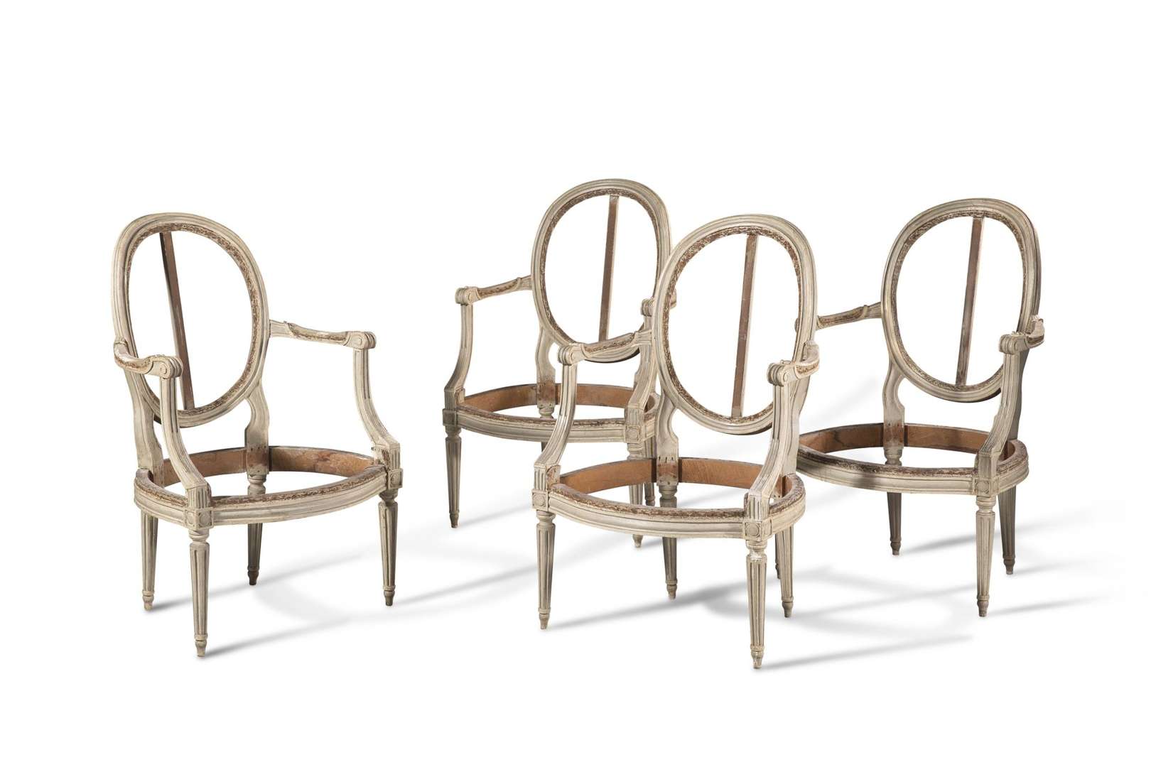SUITE DE QUATRE FAUTEUILS À DOSSIER MEDAILLON en hêtre mouluré sculpté et laqué gris. Accotoirs pour manchettes terminés en enroulements, supports d'accotoirs incurvés. Ceinture à dés de raccordement à fleurons. Pieds fuselés et cannelés. Époque Louis XVI