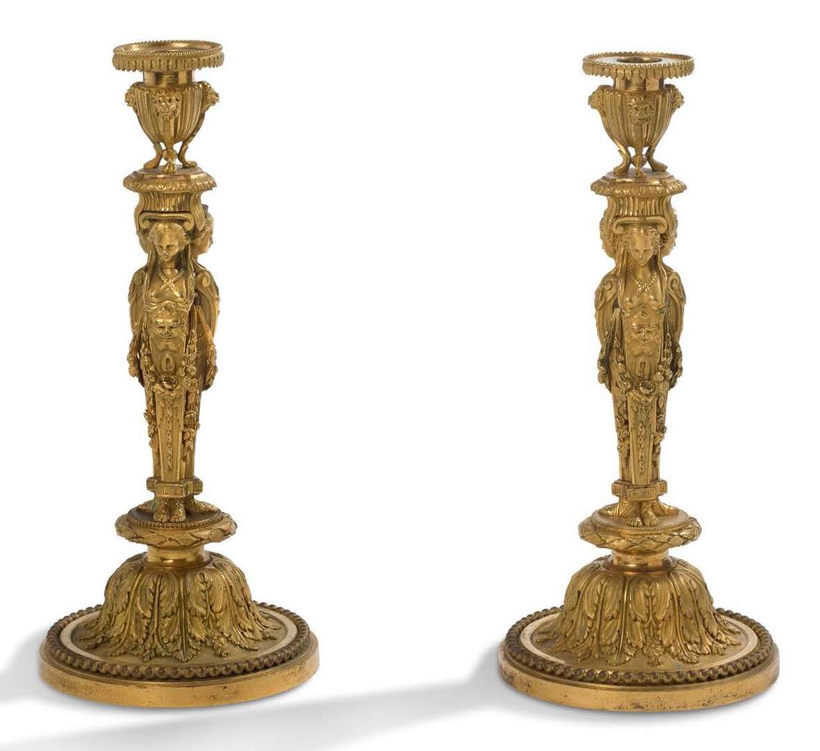 PAIRE DE FLAMBEAUX AUX CARIATIDES en bronze ciselé et doré. D'après un modèle de Jean-Démosthène DUGOURC (1749-1825) Le fût à motif de trois cariatides et guirlandes de fleurs est surmonté d'une bobèche en forme de trépied antique à masque de lion. Il repose sur une base à doucine ornée d'un rang perlé et de feuilles d'acanthe. Vers 1800
