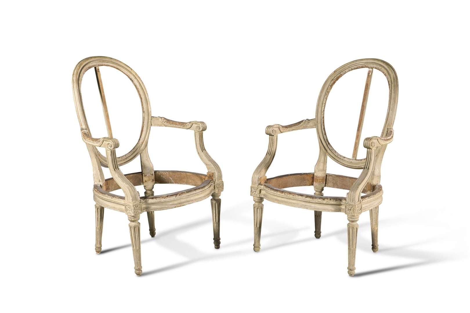 PAIRE DE FAUTEUILS À DOSSIER MÉDAILLON en hêtre mouluré sculpté et relaqué gris. Accotoirs pour manchettes terminés en enroulements, descente d'accotoirs incurvé, pieds fuselés cannelés et rudentés, réunis par un dé de raccordement à fleurons. Époque Louis XVI