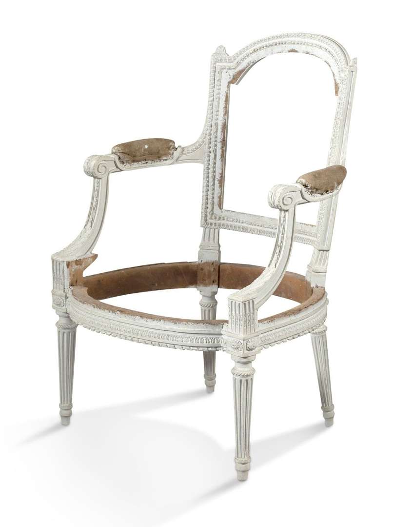 FAUTEUIL en bois naturel mouluré sculpté et relaqué blanc. Dossier de form