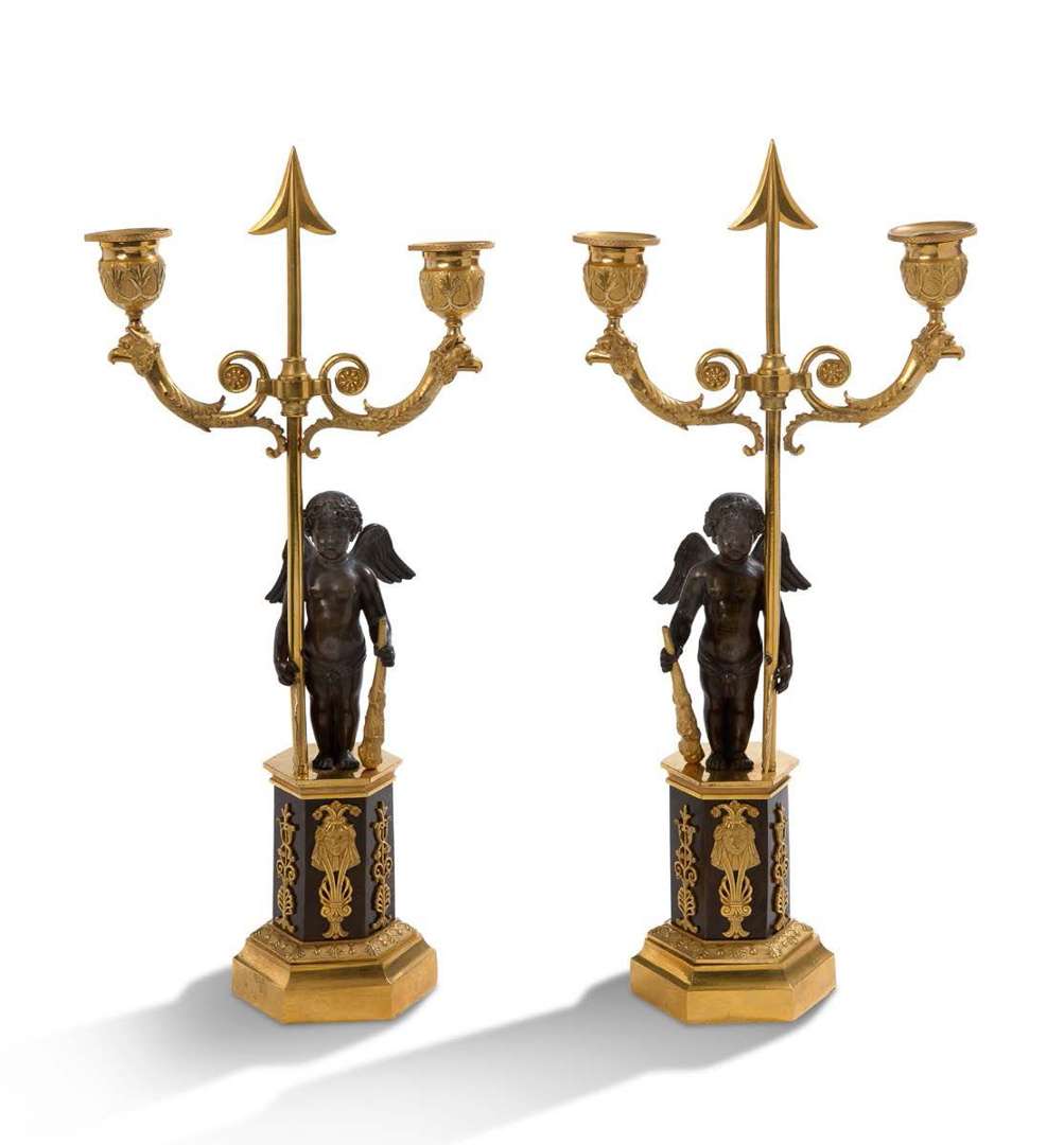 PAIRE DE CANDÉLABRES AUX AMOURS ET AUX FLÈCHES en bronze patiné, ciselé et doré à deux bras de lumières ornés de têtes de griffons terminés en enroulement. Binet orné de palmettes. Le fût central en forme de flèche est retenu par la figure d'un amour ailé tenant la massue d'hercule Il repose sur une base hexagonale ornée d'un décor appliqué de palmettes et d'une tête de femme drapée. Époque Empire