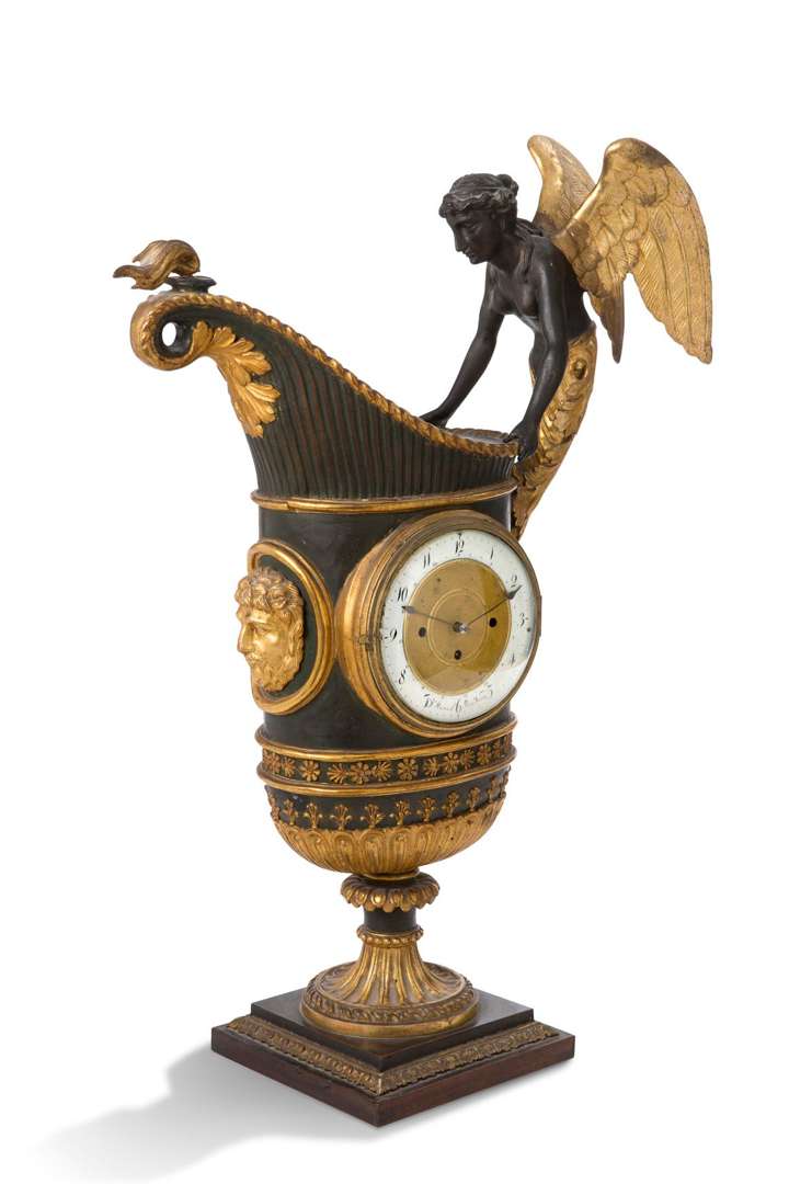 GRANDE PENDULE en forme de lampe antique sur piédouche en bois peint et doré. La anse est à décor d'une figure de jeune femme ailée, dont le corps se termine en feuille d'acanthe. La panse est ornée sur le côté d'un masque de barbu| à mi-corps d'une frise de fleurons alternant avec des palmettes, et de godrons rayonnants. Base de forme carrée à décor d'une frise de feuilles d'acanthe. Vienne, XVIIIe siècle