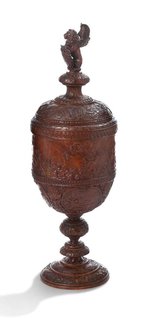 COUPE SUR PIED en bois fruitier sculpté d'un décor mythologique du cycle de Neptune et Amphitrite sur la panse. Fût balustre à noeuds reposant sur une base de forme ronde, le couvercle est surmonté d'un lion ailé supportant des armoiries d'alliances. Le couvercle est orné d'un décor sculpté de trophées d'armes, frise de lauriers, entrelacs, et piastres. La panse présente à mi-corps un décor de Dieux fleuves dans des réserves alternant avec des têtes de satyres. La base est ornée de trophées d'instruments de musique et de paysages miniatures dans des réserves. Italie ou Allemagne, fin du XIXe siècle. Dans le goût de César Bagard (1620-1709)