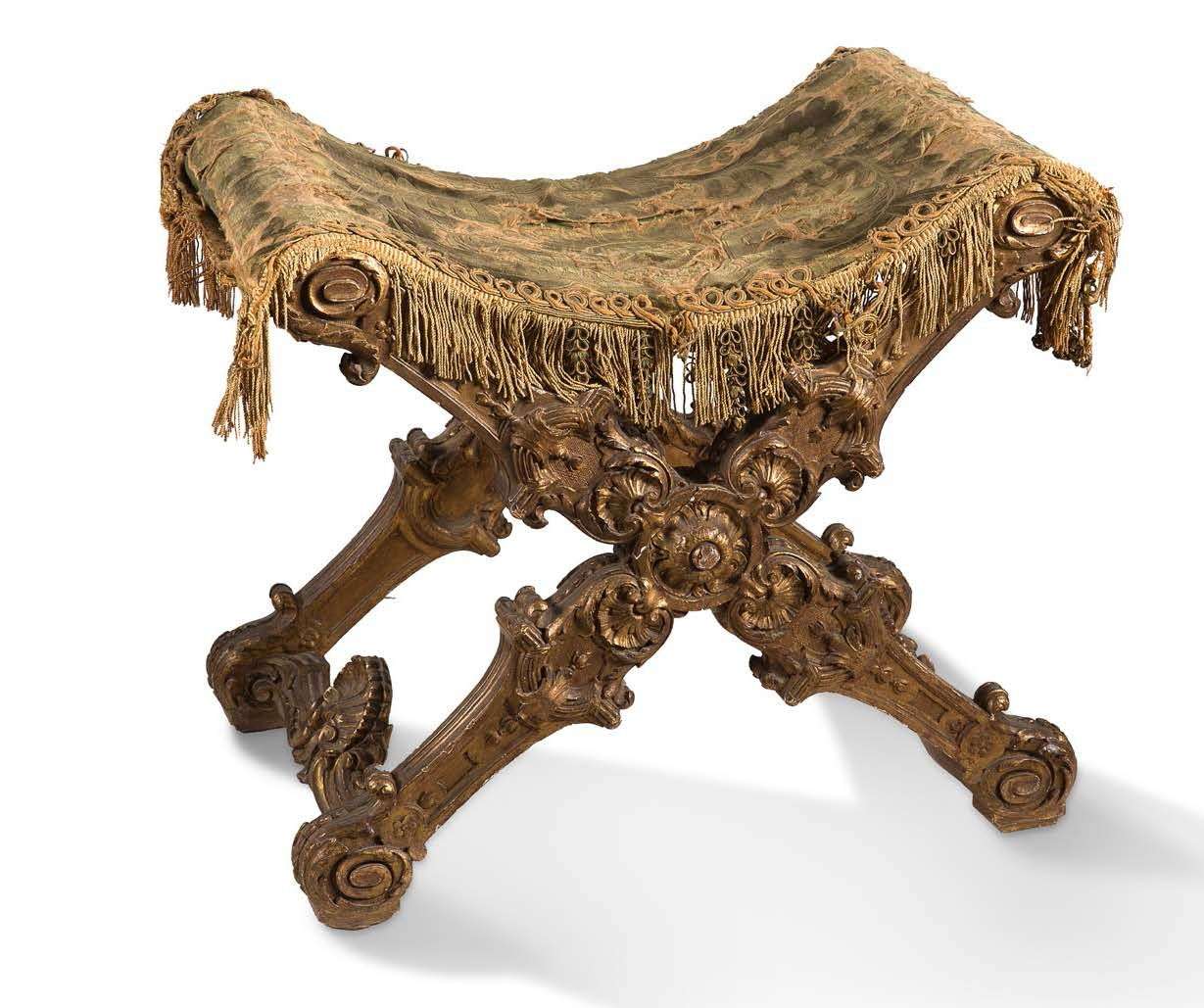 PAIRE DE PLOYANTS en bois mouluré, finement sculpté et doré. Piètement en X à décor de coquilles, et fleurons terminés en enroulement. Garniture de velours de soie vert sur fond de velours jaune à larges feuilles dentelée à passementeries. Style Louis XIV, époque début du XIXe siècle