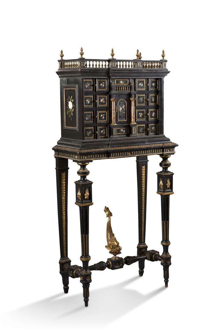 CABINET en bois noirci, bois doré et marqueteries de marbre de couleurs. Il ouvre en façade par neuf tiroirs et un vantail central à colonnes corinthiennes découvrant deux tiroirs. Décor de fleurs en pietra dura (muguet, aubépine, marguerite, lys, liseron, myosotis...). La caisse repose sur quatre grands pieds réunis par une entretoise en H ornée en son centre d'un dauphin. Galerie ajourée à balustrade et pots à feu. Pieds antérieurs fuselés et cannelés surmonté d'un balustre. Pieds postérieurs en forme de gaines à motifs de piastres.Travail de style Louis XIV, fin du XIXe siècle