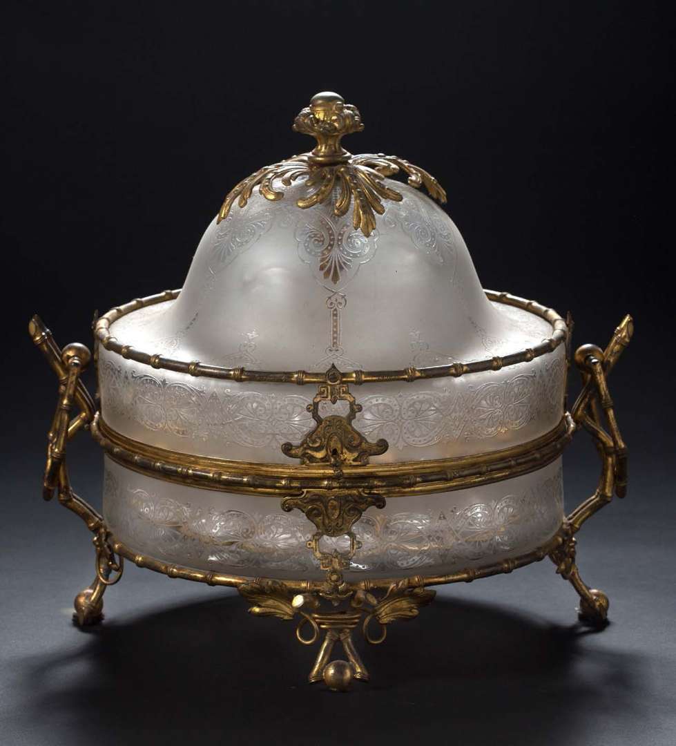 Cave à liqueur en cristal taillé et monture en bronze ciselé et doré. Elle renferme quatre carafes et seize verres à décor gravé de frises de grecques La cave en cristal présente un décor finement gravé sur fond mat s'inserrant dans une monture en tige de bambous. Prise en forme de boutons et feuillages. Un système de blocage permet de maintenir le couvercle ouvert.Seconde moitié du XIXe siècle