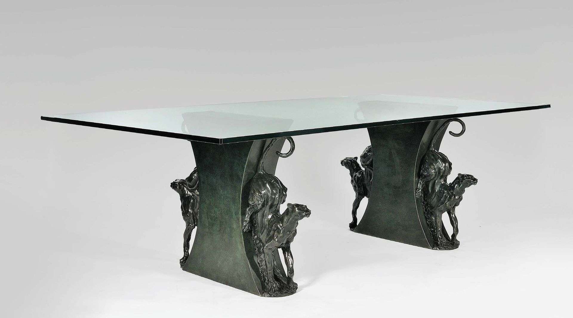 Exceptionnelle table de salle à manger modèle «Guépards» en bronze à patine noire nuancée vert reposant sur deux montants décorés de deux guépards rampant.Plateau rectangulaire en épaisse dalle de verre.Fonte à la cire perdue épreuve 1/8, signée «José Maria David».Cachet du fondeur Landowski.Modèle créé en Avril 2008.