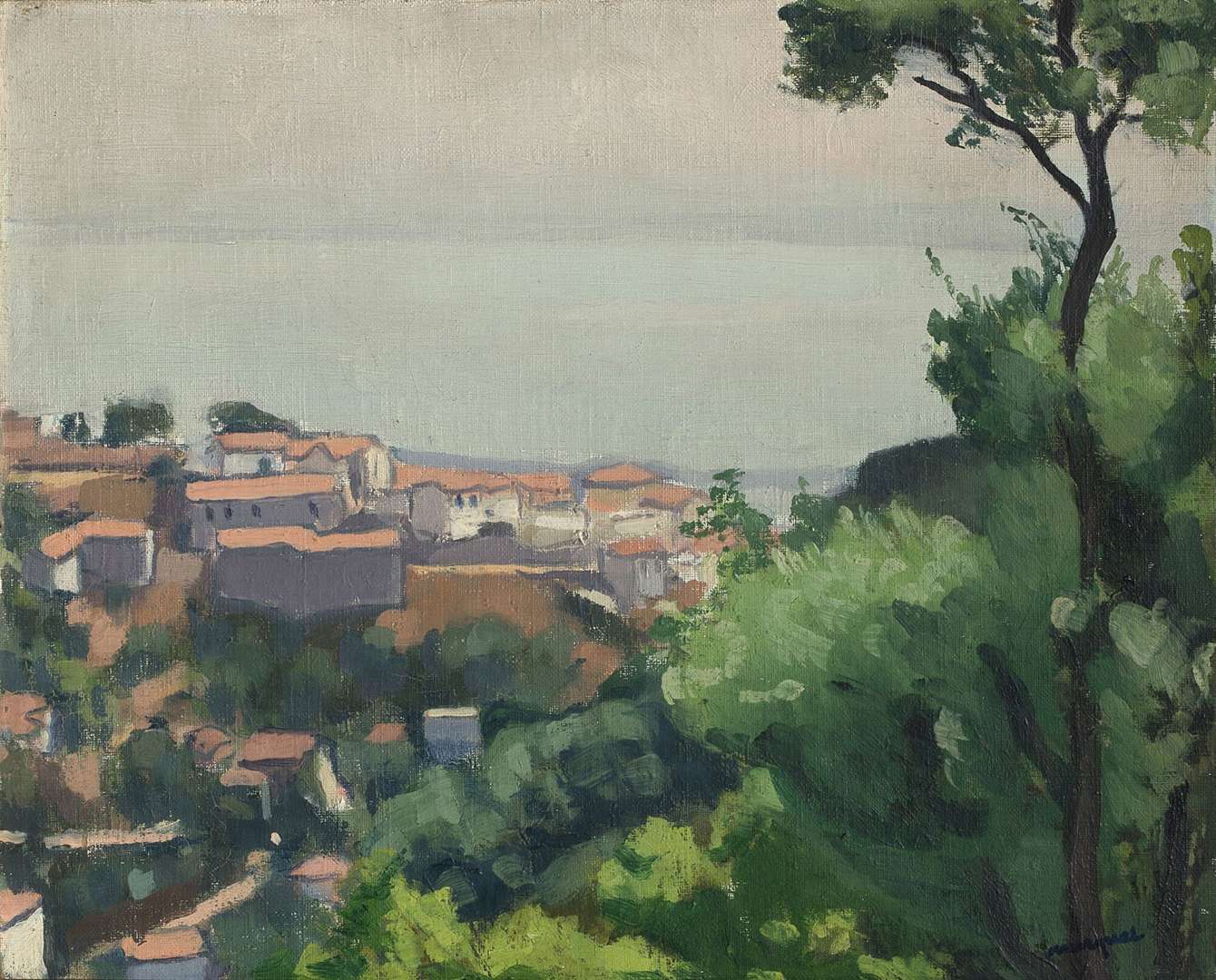 Issu d’une famille modeste, Albert Marquet est un peintre français né en 1875 à Bordeaux. Il est attiré dès son plus jeune âge par le dessin, et entre à l’Ecole nationale des arts décoratifs de Paris à partir de 1892. C’est là qu’il rencontre Henri Matisse, qui le prend sous son aile et avec qui il se lie d’amitié. Peu de temps après, les deux artistes rentrent aux Beaux-arts de Paris et fréquentent alors l’atelier de Gustave Moreau. Ce dernier le pousse à fréquenter les musées afin d’apprendre à observer et copier les maîtres anciens. Dans cet établissement, il rencontra les artistes Charles Camoin et Henri Manguin qui restèrent ses compagnons tout au long de sa vie. Sa formation classique n’exclut pas un intérêt vif pour les Impressionnistes. Leur façon de représenter et d’étudier les paysages ou de traiter la lumière le fascine et l’inspire profondément. Toute sa carrière, l’étude de paysages reste son sujet de prédilection, cependant, il s’éloigne des techniques artistiques de ces derniers. Le Salon d’Automne de 1905 est un tournant dans sa carrière, il y expose avec le groupe d’artistes qui sera bientôt appelé les « fauves » dont Matisse est le chef de file. Artiste indépendant et créatif, il s’en éloigne peu à peu pour construire son propre style. Du fauvisme, il gardera les couleurs pures, les formes simplifiées, et la synthétisation de la composition. D’autres influences viennent également construire la singulière identité artistique du peintre, comme le japonisme, ou encore le symbolisme. Marquet est attaché à représenter l’essentiel, il recherche l’harmonie de l’équilibre parfait. Au cours de sa carrière, le peintre a effectué de nombreux voyages. Alger, Normandie, Norvège… autant de destinations qui ont formées l’œil de Marquet. Celui-ci s’attache à représenter les paysages qu’il a traversés. Son talent est définitivement reconnu. Il connaît un succès certain au cours de sa vie, et expose à plusieurs endroits en Europe et en dehors. L’artiste décède en 1947 à Paris. Mustapha Supérieur est caractéristique de l’œuvre de Marquet. Évoquant la douceur du climat méditerranéen en hiver, l’artiste couche sur la toile sa sensibilité particulière pour un pays dans lequel il choisit de passer ses hivers. Les larges aplats et la simplification des formes permettent d’apporter une quiétude caractéristique des œuvres de Marquet. La vue en plongée du village, qui est aujourd’hui un quartier d’Alger, offre un aperçu remarquable sur l’immensité de la baie et de la mer se confondant avec le ciel. L’héritage fauve se retrouve avec parcimonie dans une palette habilement contrastée. Les tonalités vertes viennent se juxtaposer avec la douceur des toits ocres. Cette vision de quiétude évoque les célèbres vers du poète Charles Baudelaire : « Là, tout n’est qu’ordre et beauté, luxe, calme et volupté ».