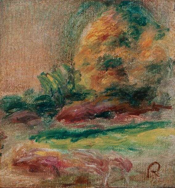 Ce fragment de paysage vibrant est un parfait exemple du génie de Renoir, où des couleurs vives et un pinceau libre créent une image viscérale de la nature. Toute sa peinture est un exercice d'équilibre| pour chaque touche de couleur vive, l'artiste laisse la toile nue ou un aplat sommaire, pour chaque jaune, rougeoyant sous le soleil du Sud, Renoir peint son pendant dans un trait de violet. Chacune de ces oppositions aboutit à un paysage dans son ensemble, plein de vitalité. C'est cette vitalité que Vincent van Gogh avait tant admirée dans le travail de Renoir. Dans une lettre adressée à son frère Théo en 1885, il avait déclaré que Renoir lui avait rappelé qu'il "y a de la vie dans chaque trait de crayon". Par ailleurs les subtiles variations et superpo