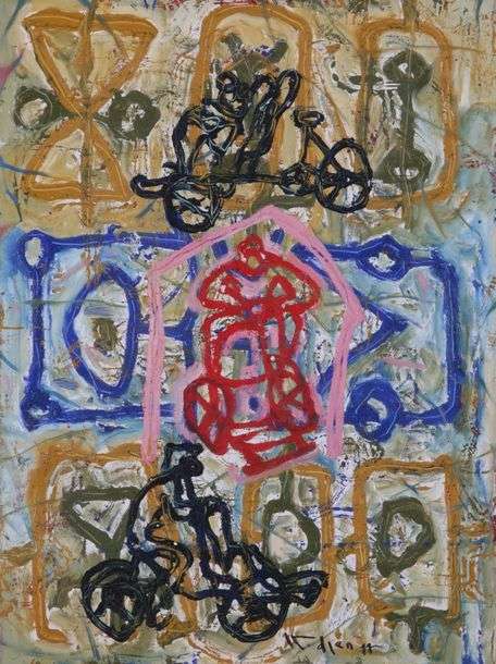 Artiste vietnamien, Le Trieu Dien (né en 1943) a étudié à l’Université polytechnique de Phu Tho à Ho Chi Minh Ville où il travaille toujours. Se situant entre la figuration et l’abstraction, il s’applique à représenter son histoire sur la toile, et notamment ses souvenirs des paysages du Delta du Mekong. Son langage pictural est proche d’une écriture, il use de la répétition et de signes particuliers dont certains portent une signification. Le triangle par exemple peut représenter un chapeau vietnamien ou le toit d’une maison. Il accumule également des symboles anciens des cultures Viets, Khmer et autre minorités cohabitant dans sa région. Ces symboles se trouvent sur la pierre et sur les architectures. Les scènes se superposent, et la première impression d’insouciance de l’artiste laisse place à une compréhension de l’œuvre se situant sur plusieurs niveaux. Memories 2 est sans doute le souvenir d’une scène citadine, vélos et voitures se croisent, les couleurs se confondent dans des entrelacs géométriques. Au contraire, Alluvial qui se réfère aux alluvions - ce dépôt transporté par les courants d’eau souvent à l’origine de la fertilité de la terre et de la croissance des plantes - laisse plutôt voir une scène fluvial, probablement du Mékong. Un homme portant le chapeau traditionnel vietnamien observe depuis la terre ferme les bateaux qui sont schématisés en origami, dans une scène qui nous invite à la contemplation.