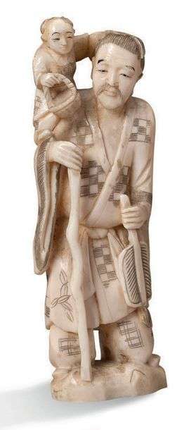 Okimono en ivoire marin représentant un homme debout, tenant un uchiwa, un enfant sur son épaule.