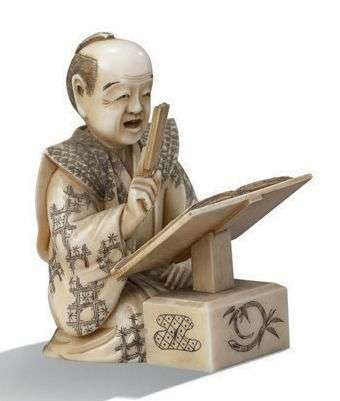 Un petit okimono en ivoire repésentant un personnage assis lisant un livre ouvert sur un lutrin.