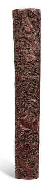 Panneau sculpté dans un demi tronc de bambou à décor en relief d'un lion bouddhique parmi des objets auspicieux.