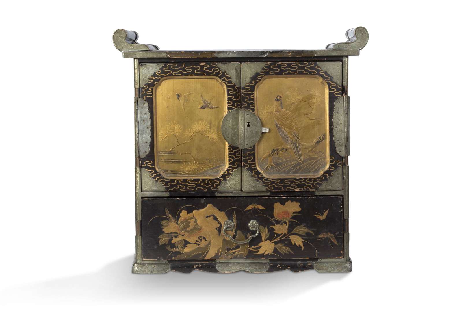 Coffret en bois laqué à décor en maki-e ouvrant par deux panneaux sur six petits tiroirs et un grand tiroir en partie basse, à décor peint or, rouge, noir et gris d'oiseaux et paysages, dont un aigle sur la partie droite et deux mésanges sur la partie gauche, un couple de grues auprès d'un cerisier en fleurs sur le dessus.~