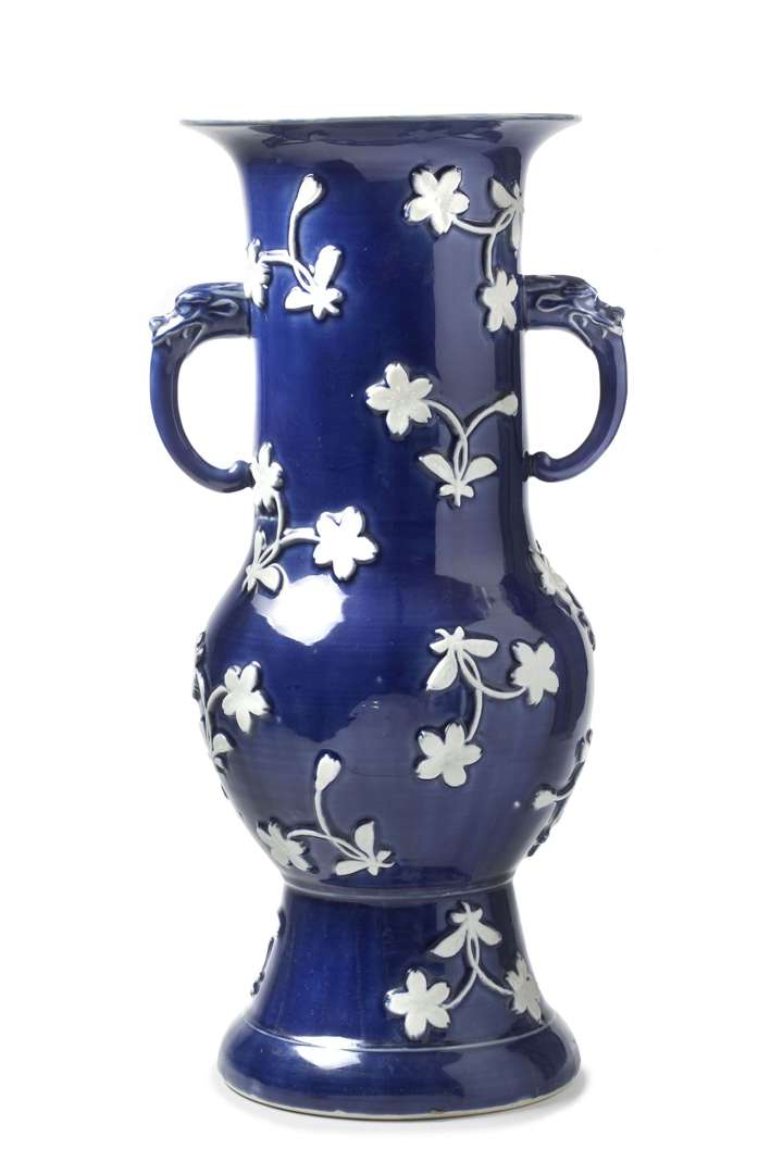 Grand vase en porcelaine à décor floral blanc sur fond bleu, aux anses crachées par des dragons.~
