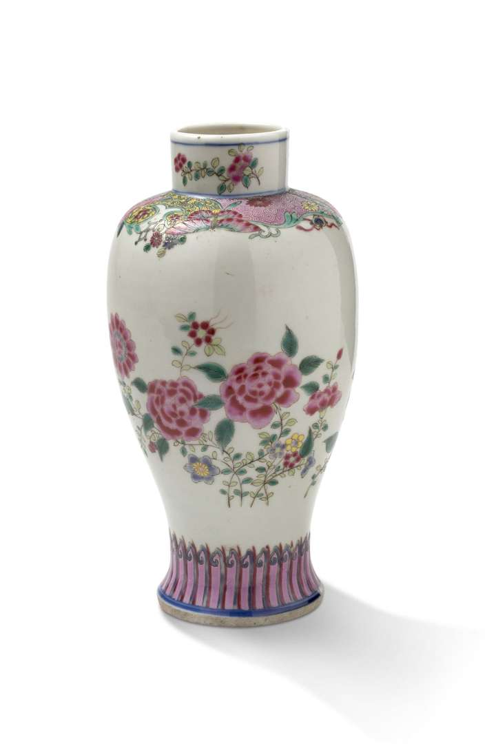 Petit vase balustre en porcelaine et émaux de la famille rose, à décor de pivoines et chrysanthèmes en fleurs. Le col orné de papillons, fleurs et rouleaux déroulés. Le pied est souligné d'une frise de feuilles de bananier stylisées.