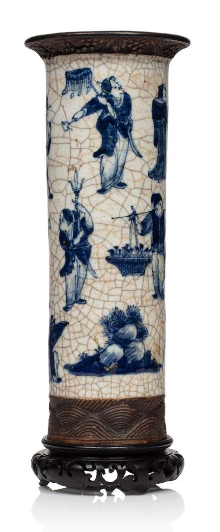 Vase rouleau de Nankin, à décor craquelé bleu et blanc de personnages dans des scènes de la vie quotidienne. Décor sculpté brun d'une frise de vagues stylisées sur le pied et de motifs feuillagés sur le bord de l'ouverture. Des feuilles de bambou sur le bord intérieur de la lèvre. Marque sur la base.