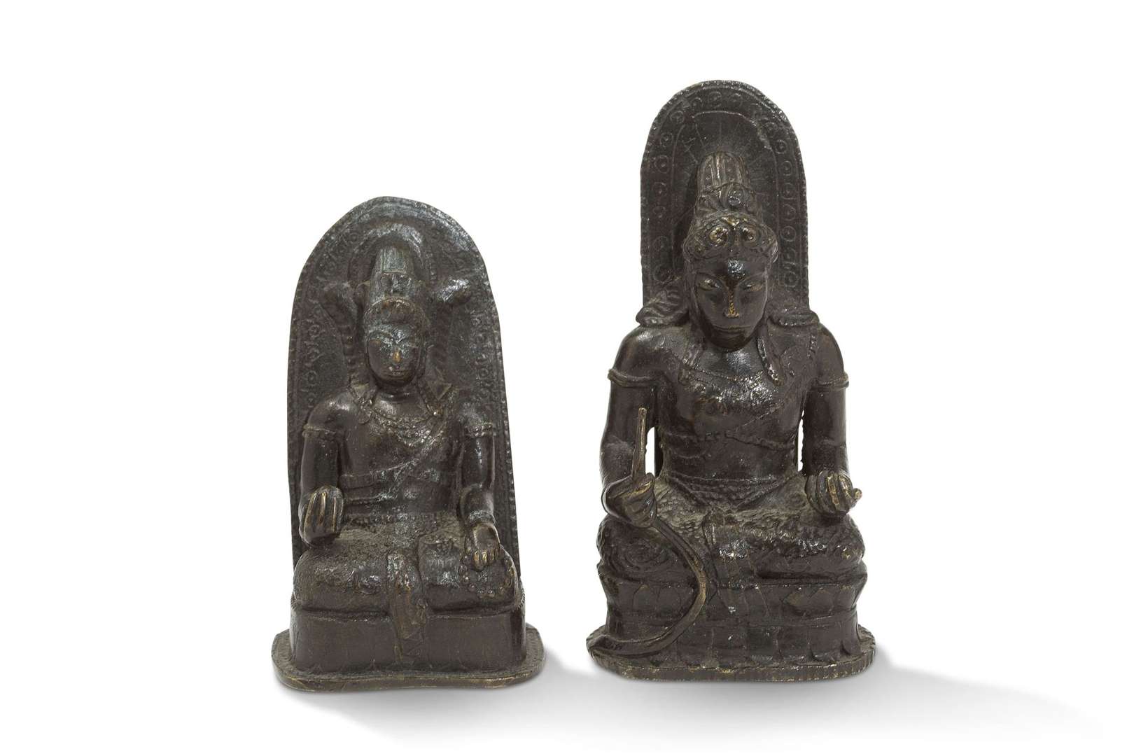 Deux sujets bouddhiques en bronze représentant des bodhisattva assis en méditation adossés à des mandorles.~
