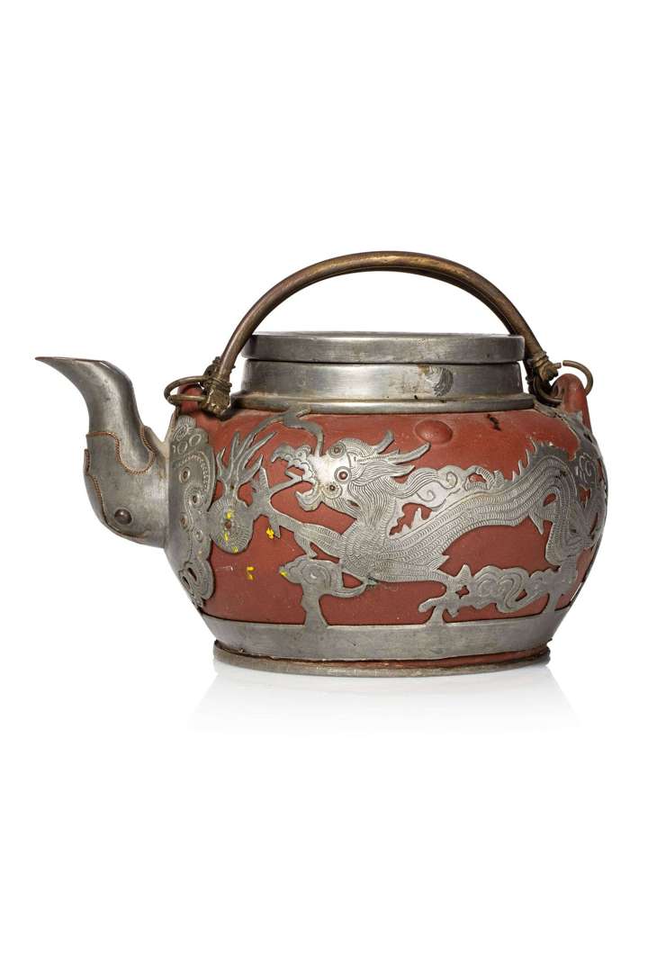 Théière en grés de yixing et métal argenté représentant un dragon. Le couvercle orné d'une sapèque à quatre caractères chinois, dont les deux de l'axe horizontal signifient "monnaie courante" et les deux de l'axe vertical indiquent la période Guangxu. Marque apocryphe sur la base, cerclée de métal gravé avec la mention "Heaiwei hsw Hocheng" (?).~