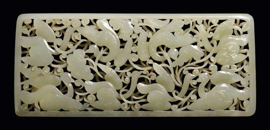 Plaque rectangulaire en jade blanc céladonné à décor ajouré d'oiseaux dans des ramures et feuillages.