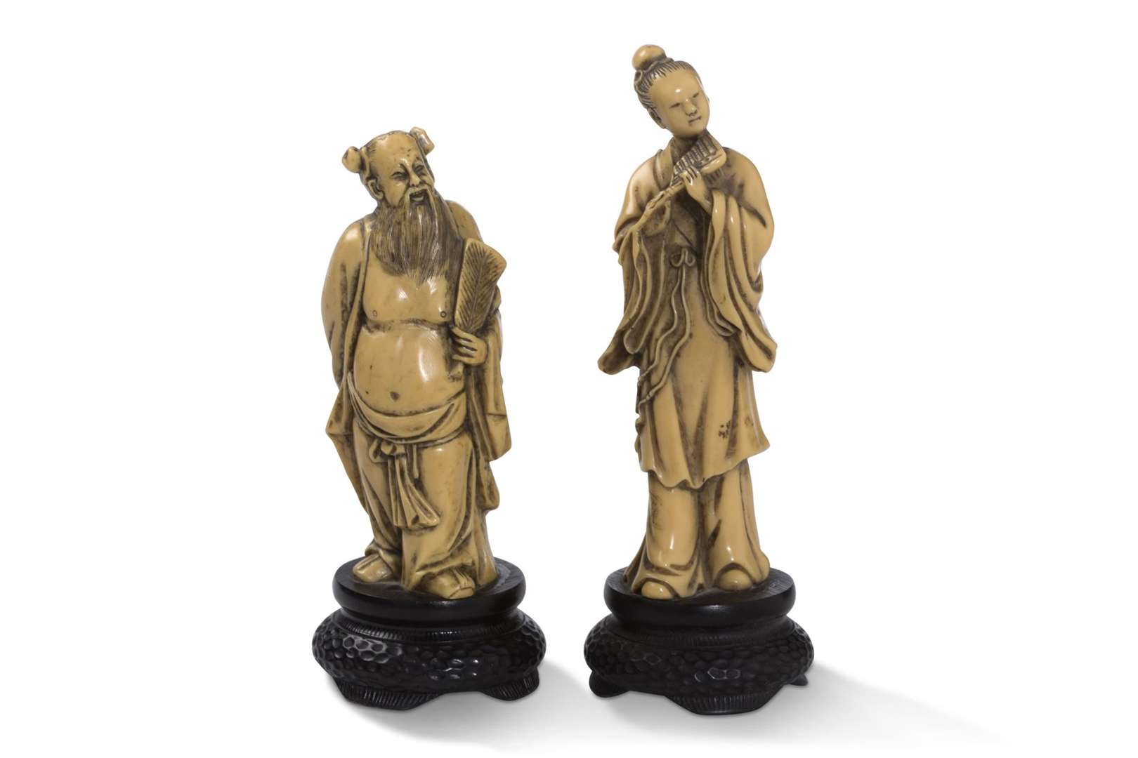 Deux sujets en résine à l'imitation de l'ivoire, représentant respectivement un sage du Tao et une musicienne.