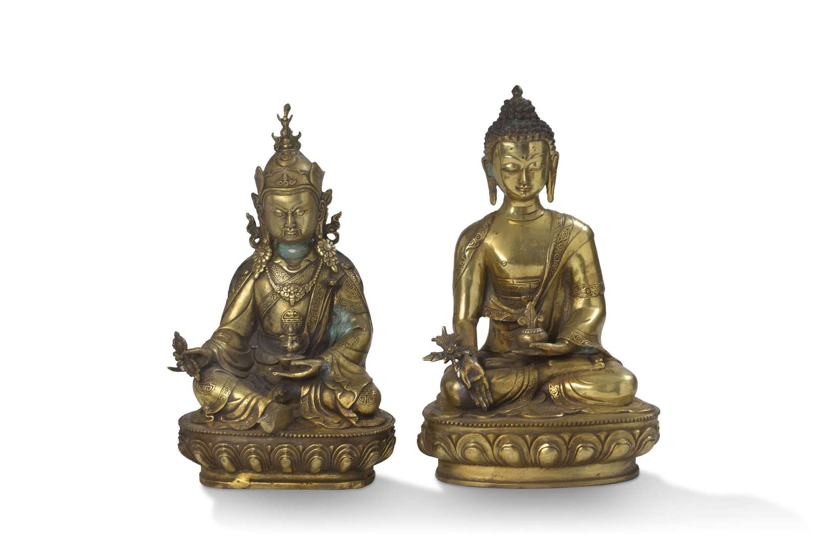 Deux sujets bouddhiques en bronze doré | l'un représentant le Bouddha en v