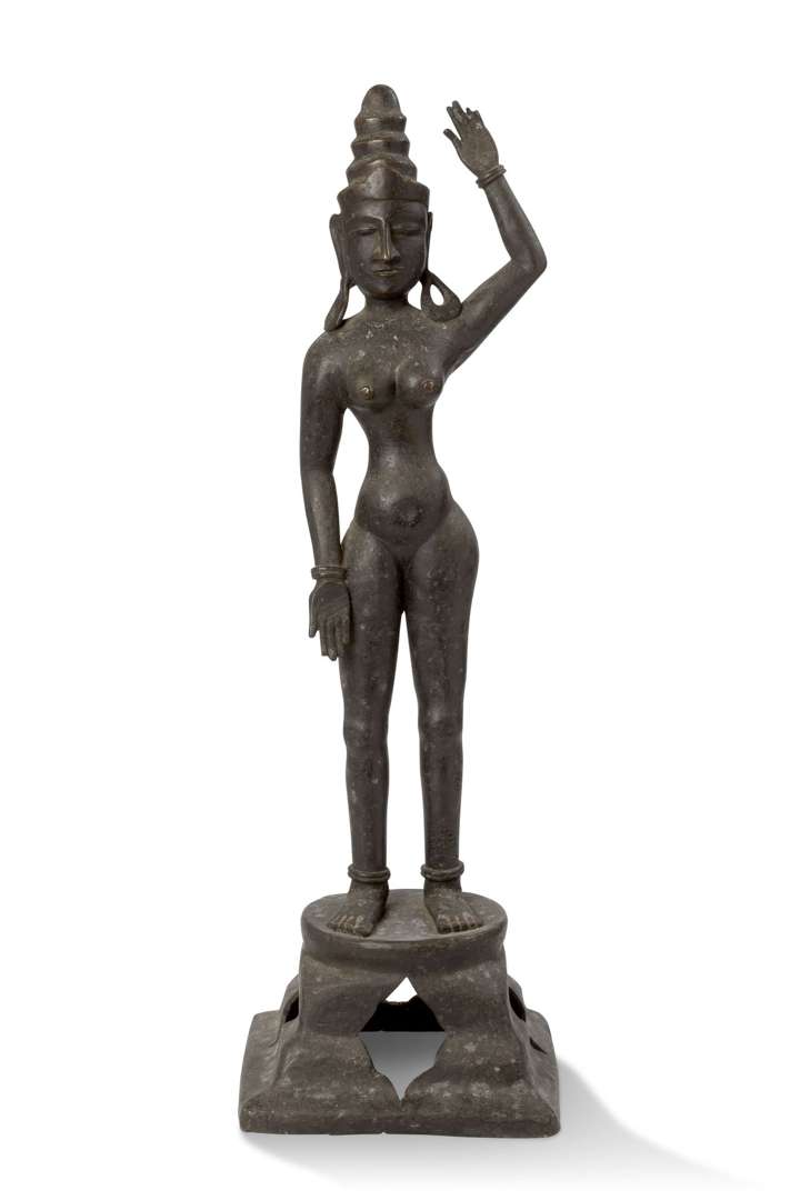 Sujet en bronze représentant une divinité féminine filiforme nue, levant le bras gauche vers sa coiffe, l'autre main présentée la paume ouverte, debout sur un socle circulaire à quatre pieds.