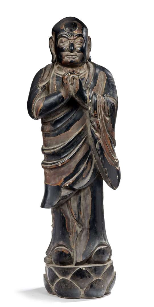 Sujet en bois représentant Bouddha les mains jointes, debout sur son lotus, vêtu de la robe monastique.