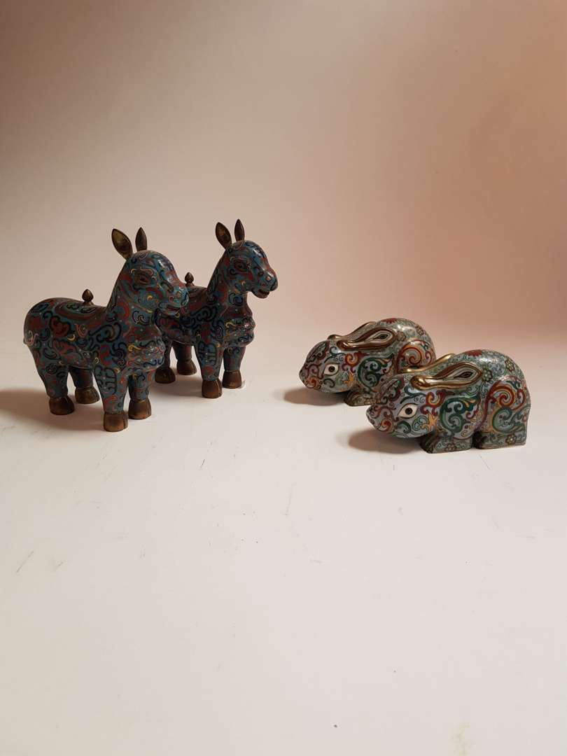 Ensemble de deux paires animalières en émaux cloisonnés. L'une à tonalités rouges, vertes et jaunes sur un fond lavande représentant des lapins aux yeux exorbités | l'autre à tonalités rouges, bleues et jaunes sur un fond bleu représentant des ânes formant brûle-parfums couverts.