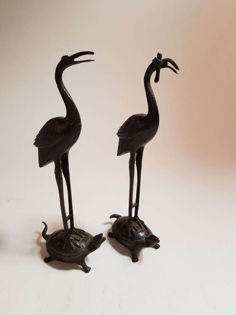Paire d'ibis ou grues en bronze sur des tortues minogames.
