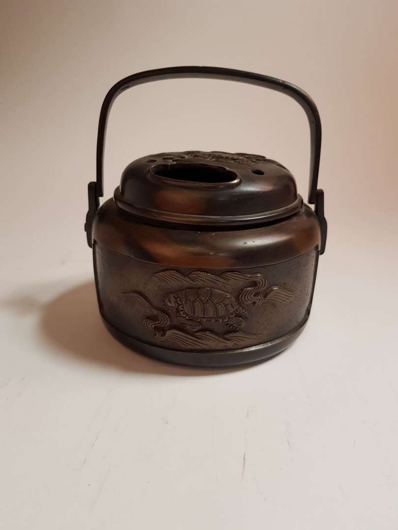 Boite circulaire en bronze surmontée d'une anse, à couvercle ajouré à décor d'une tortue sur une plage de sable, le pourtour à décor zébré de noir et brun et de deux registres en relief rappelant le motif de la tortue sur une plage du couvercle.