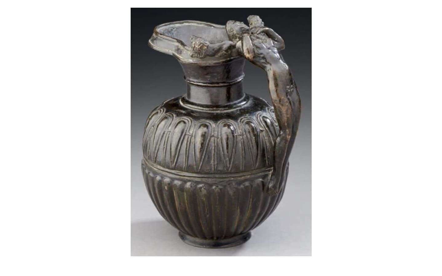 formant aiguière en bronze ciselé et patiné vert. La prise en forme de femme, le col souligné de deux lions.
