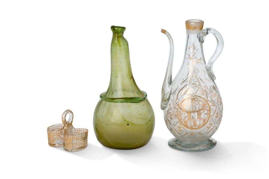 On y joint : une salière en verre double (H. 7 | L. 7 cm) et une bouteille en verre soufflé vert (H. 22 cm )