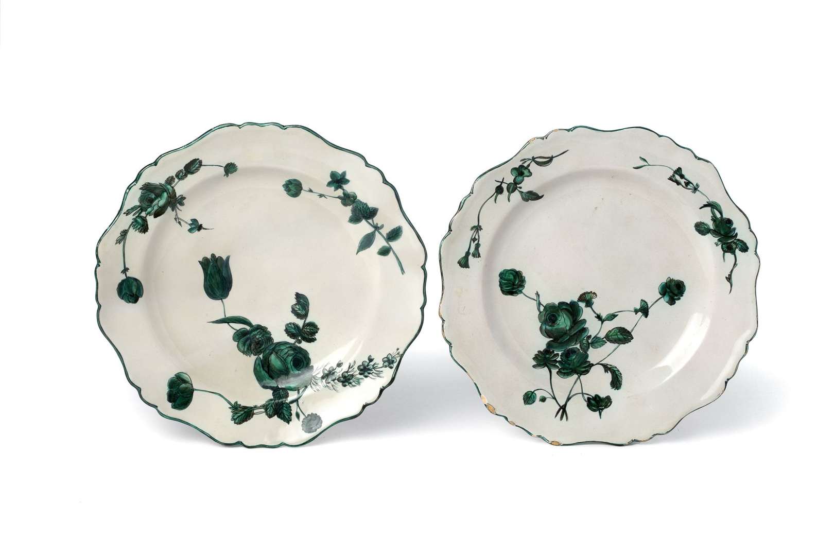 Réunion de deux assiettes en faïence à bords contournés ornées d'un décor de bouquets décentrés en camaïeu vert