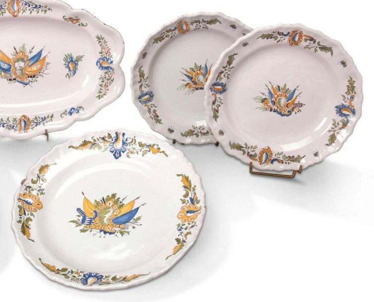 Trois assiettes et une grande assiette en faience décorées en polychromie «Au Drapeau» au centre d'un important trophée, sur l'aile de quatre cartouches et de quatre petits insectes